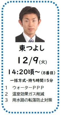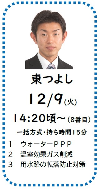 この日の8番目には、東つよし議員が3つのテーマを掲げ、質問に立ちます。