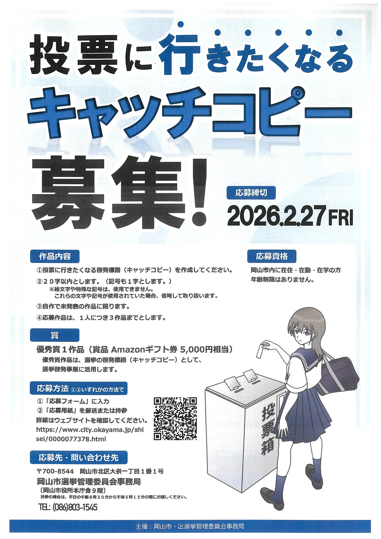 岡山市選挙管理委員会が、「選挙に行きたくなるキャッチコピー」を募集しています。