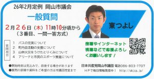 日本共産党岡山市議団の東つよし議員は、26日の3番目に登壇します。