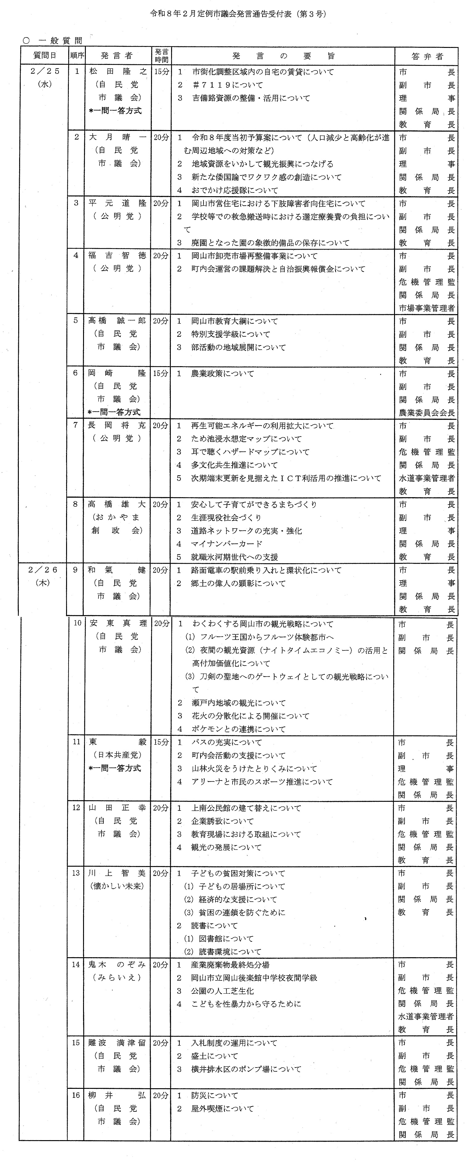 岡山市議会2026年2月定例会は、代表質問に続き、25日と26日に一般質問を行います。