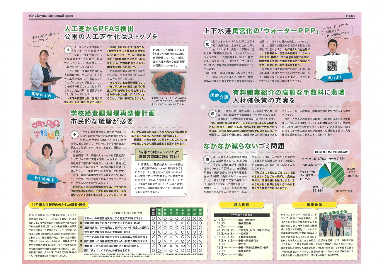 2・3面・・人工芝からPFAS検出 公園の人工芝生化はストップを/学校給食調理場再整備計画 市民的な議論が必要/上下水道民営化の「ウォーターPPP」/医療介護 有料職業紹介の高額な手数料に悲鳴 人材確保策の充実を/なかなか減らないゴミ問題/11月議会で賛否の分かれた議案・陳情/2月議会日程/編集後記