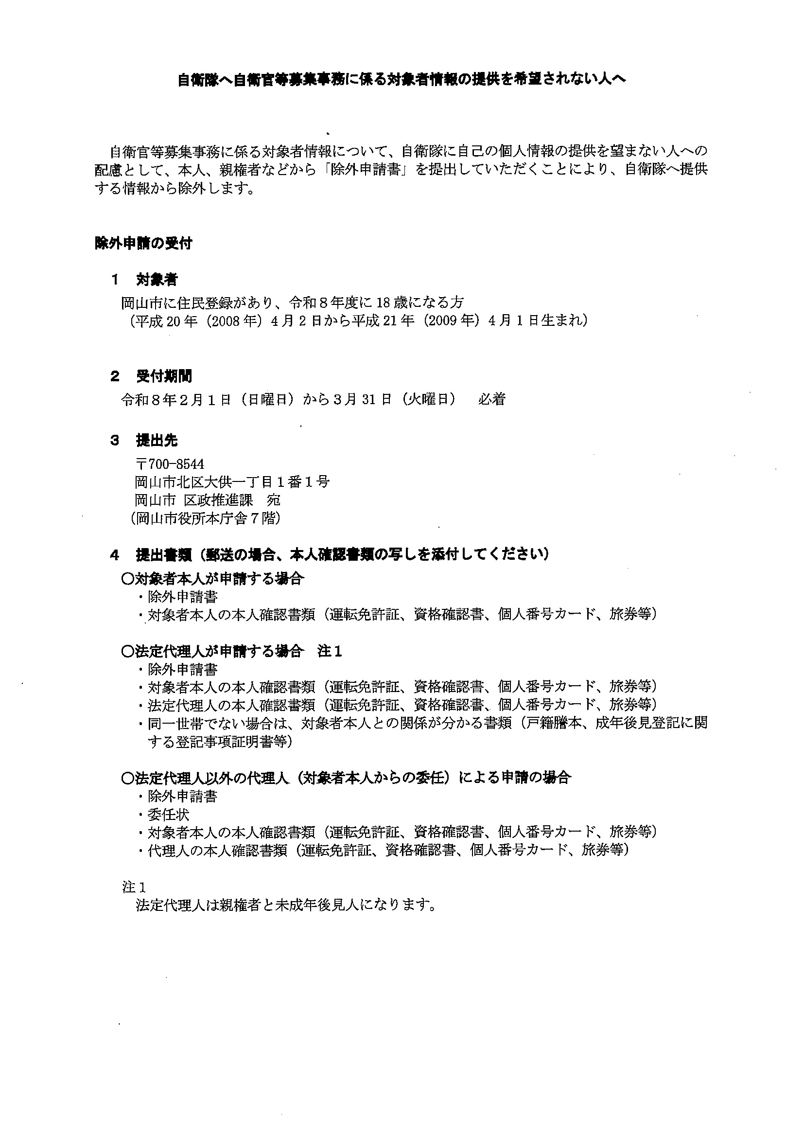 岡山市は、自衛隊からの要請に応じて、18歳になる市民の方全員の個人情報(氏名と住所)を提供しています。