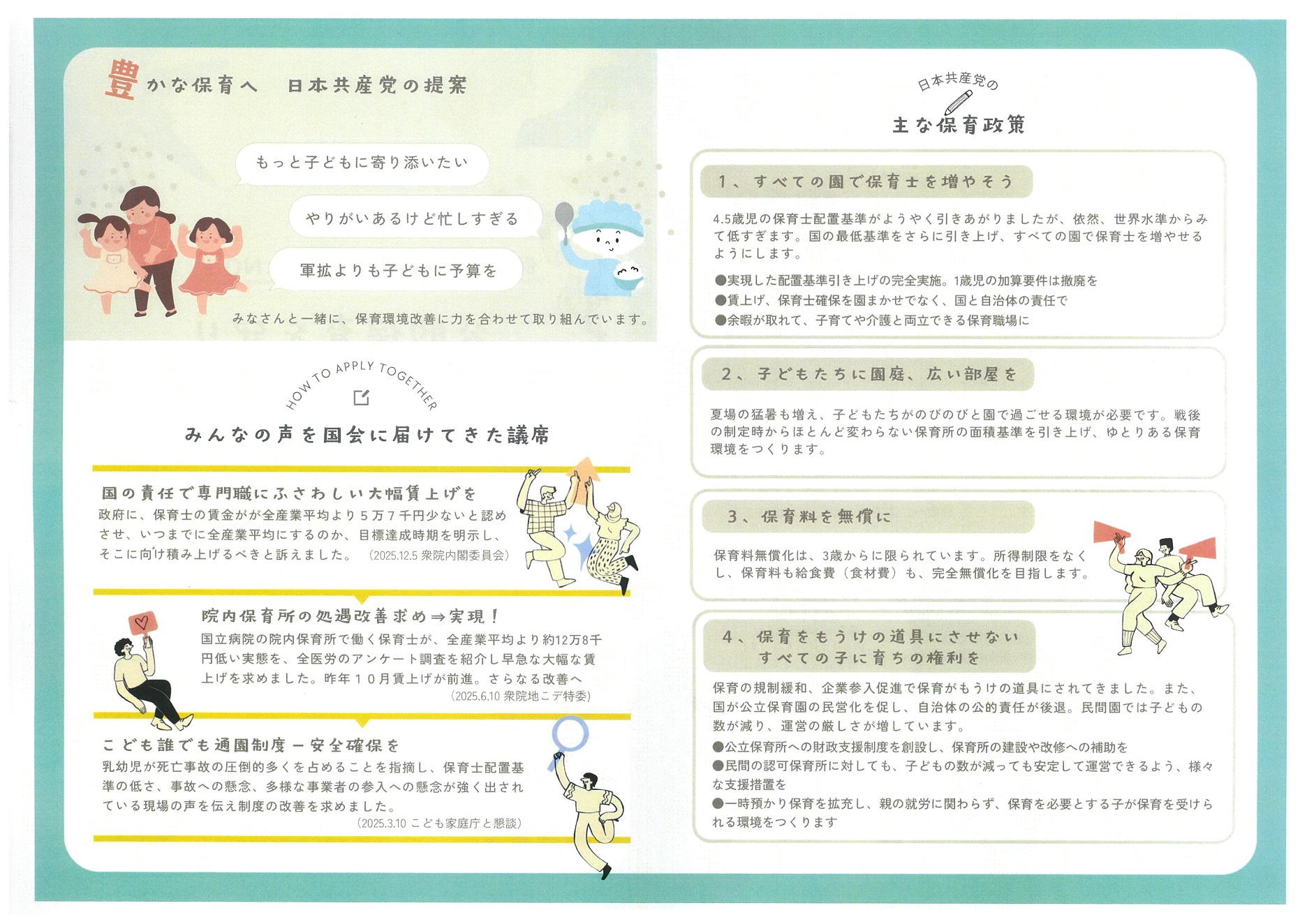 日本共産党は、保育士の配置基準の改善へ、多くの方々と力を合わせてきました。