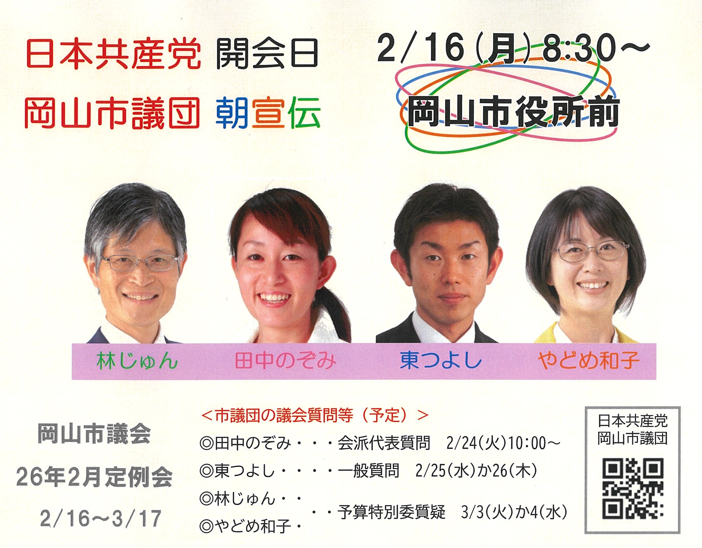 2/16(月)8:30ごろから岡山市役所前の大供交差点で、恒例の開会日宣伝を行います。