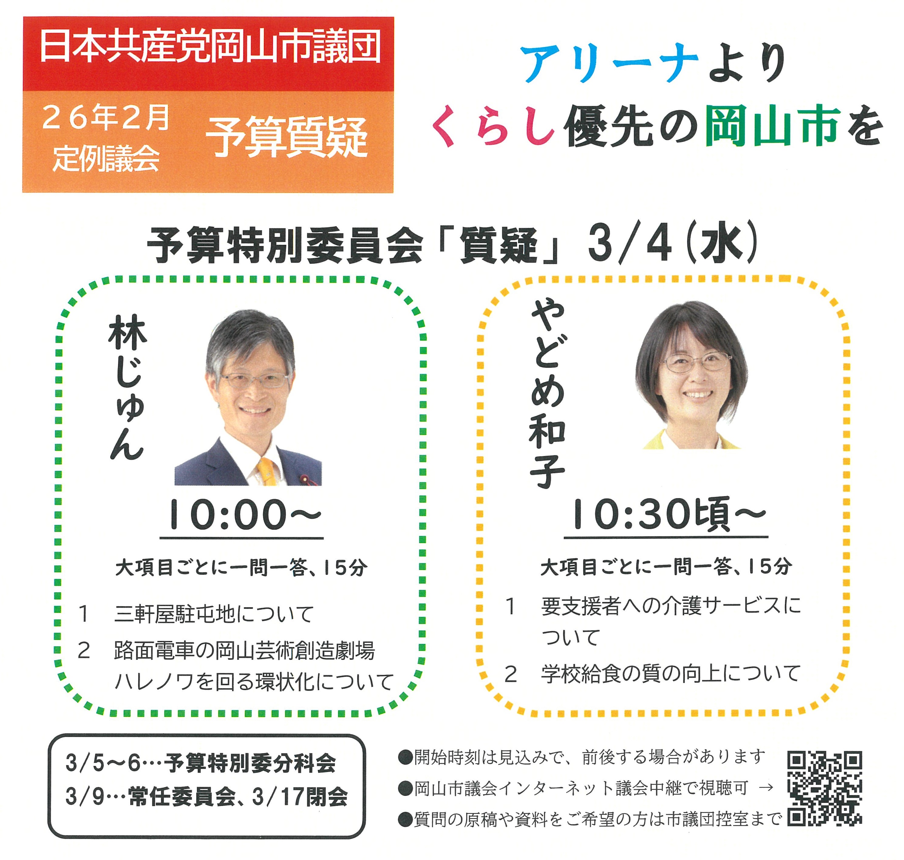 日本共産党岡山市議団の林じゅん議員とやどめ和子議員は、3/4(水)の1番目と2番目に登壇します。