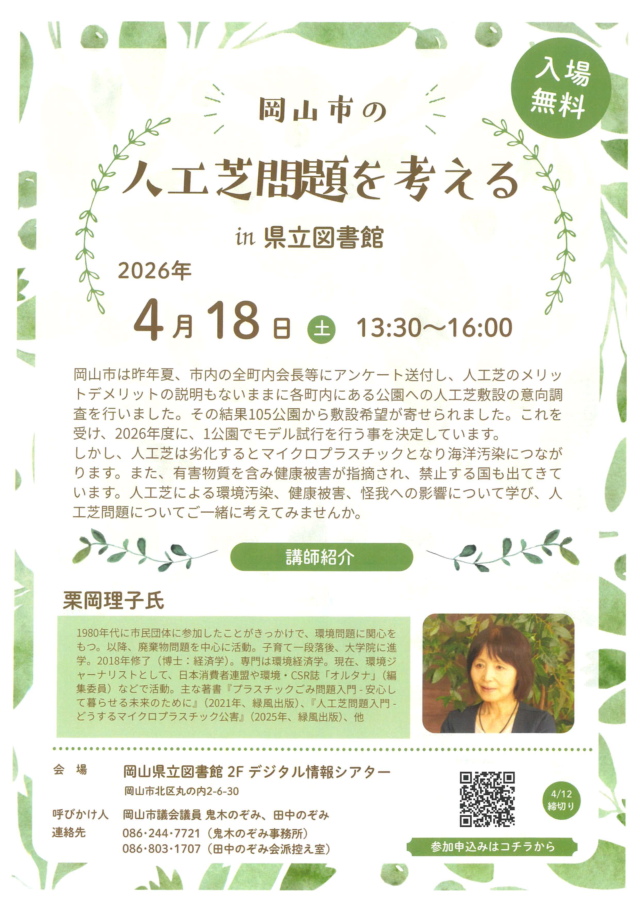 講師の栗岡理子さんは、「人工芝問題入門-どうするマイクロプラスチック公害」などの著書があり、環境省が審査・登録する「環境カウンセラー」のおひとりです。